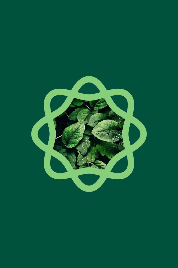A minimalist botanical composition featuring fresh green leaves framed within a geometric, interlocking star-like border in pale lime green. The design combines organic natural imagery with clean geometric framing against a rich teal background, creating a modern, eco-conscious aesthetic.