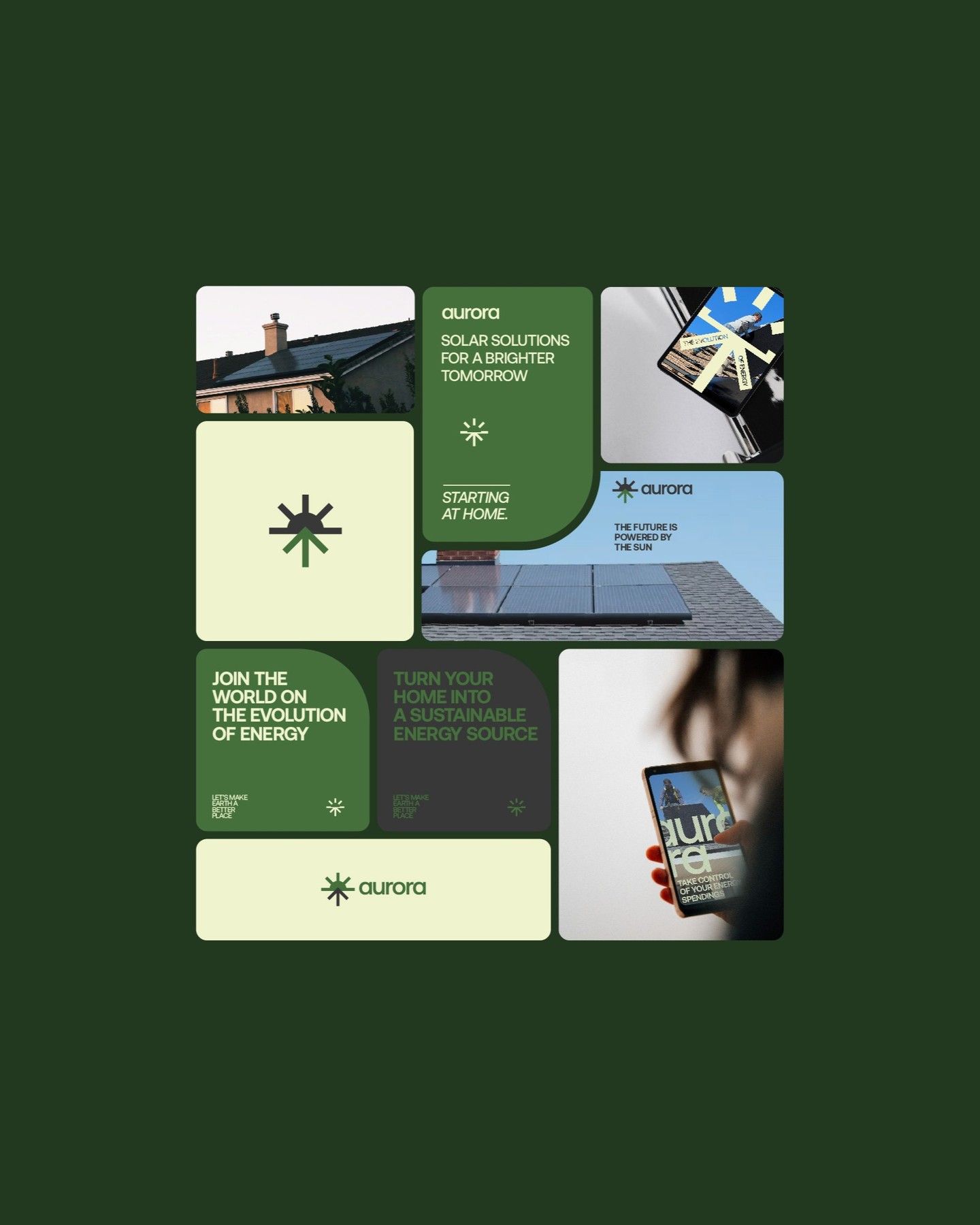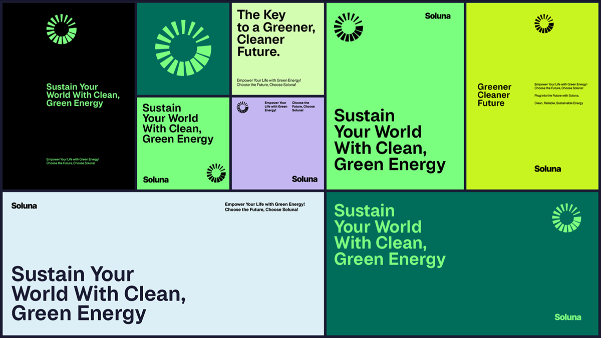 This design utilizes a clean, modular grid layout to present information about green energy solutions. The visual language is modern and optimistic, relying on vibrant yet natural shades of green and yellow to convey a sense of environmental responsibility and freshness.
