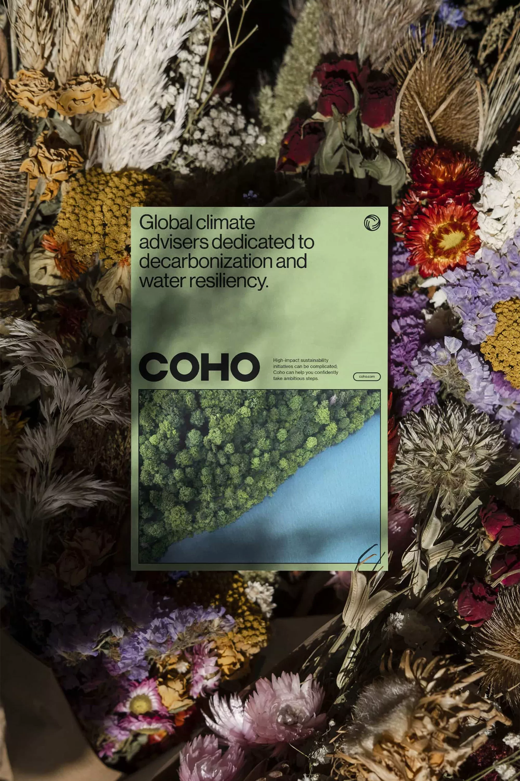 This image features a densely textured, naturalistic arrangement of dried botanicals and foliage, serving as a backdrop for a clean, modern informational card. The design balances organic texture with stark, minimalist typography and a cool blue accent, creating a sophisticated and environmentally conscious aesthetic.