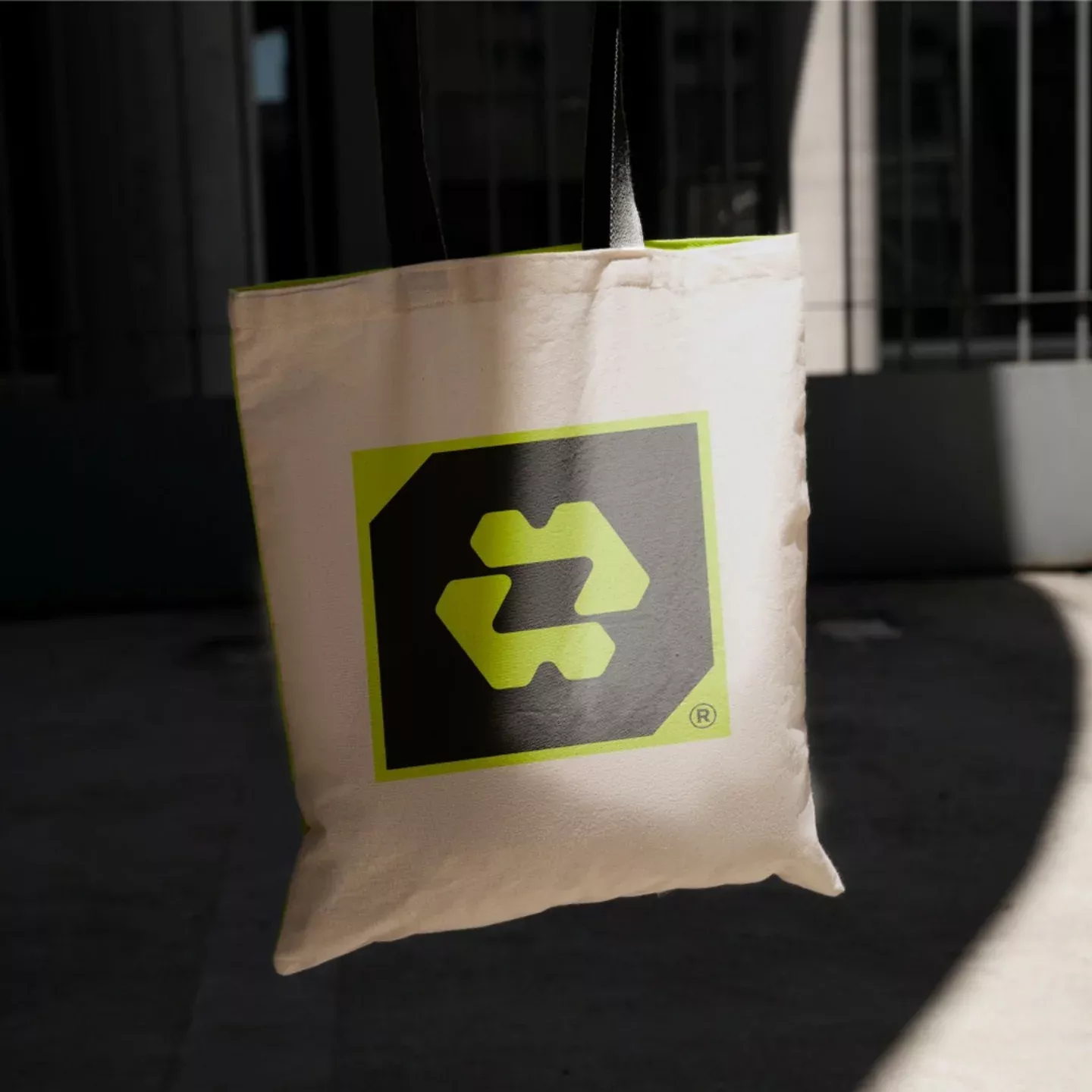 This image showcases a minimalist tote bag, emphasizing natural texture and clean lines against a dark backdrop. The design relies heavily on high contrast between the off-white fabric and the bold, vibrant recycling symbol to convey a message of environmental responsibility.