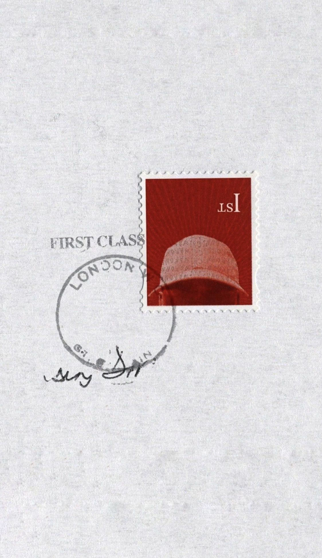 This image features a vintage-inspired postage stamp design combining formal graphic elements, such as perforated borders and block text, with delicate handwritten script. The visual language successfully evokes nostalgia and the feeling of historical correspondence or philately. It achieves a balanced aesthetic between structured design and personal, archival charm.