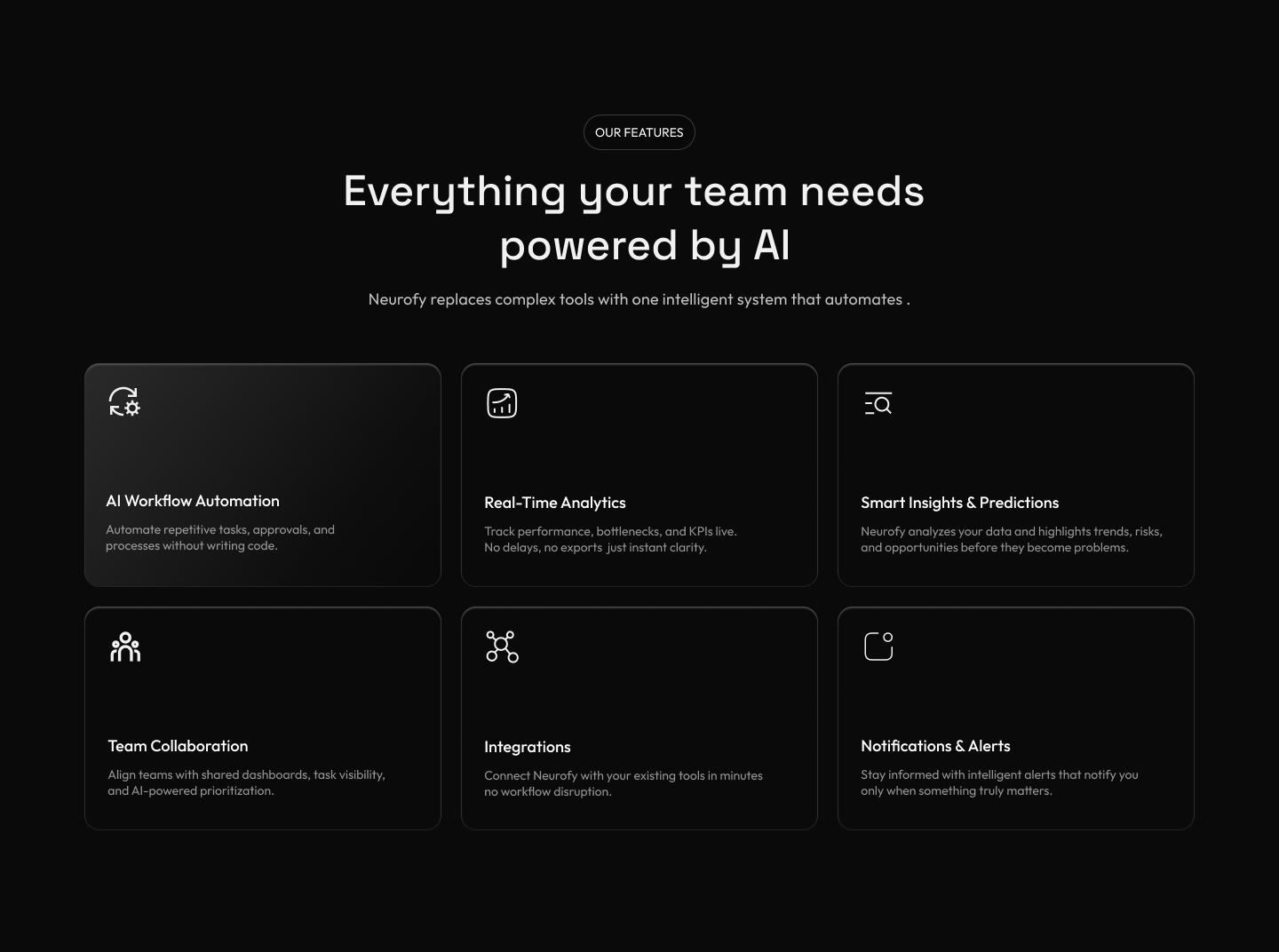 The design is clean, modern, and professional, utilizing a dark background with light text and subtle iconography to present features clearly. The layout is structured using a grid of equally sized cards, emphasizing functionality and organization.