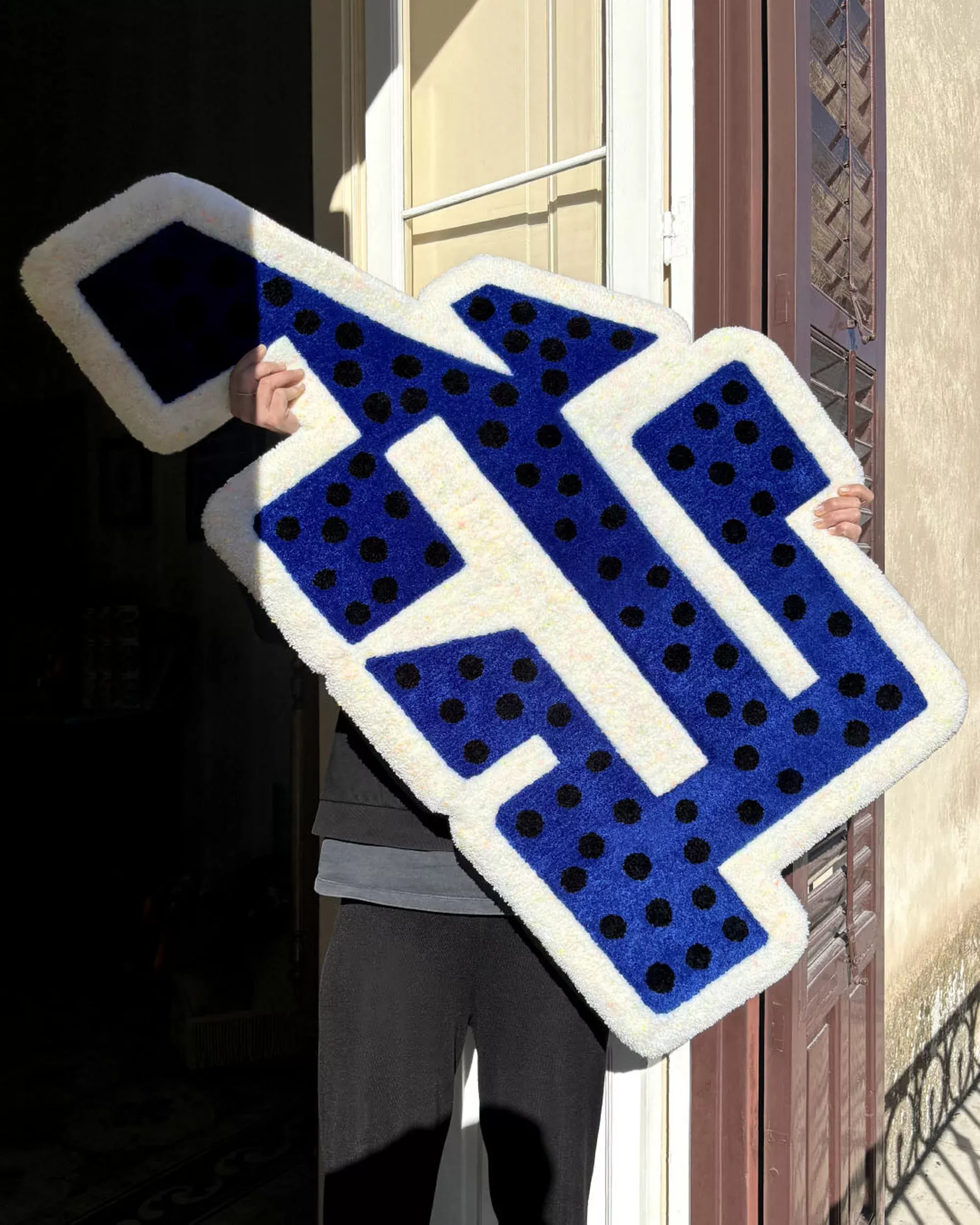 This image showcases a tactile, felted emblem featuring bold geometric shapes and high-contrast colors. The design combines solid fields with a speckled texture, resulting in a striking piece of wearable merchandise or decorative craft.