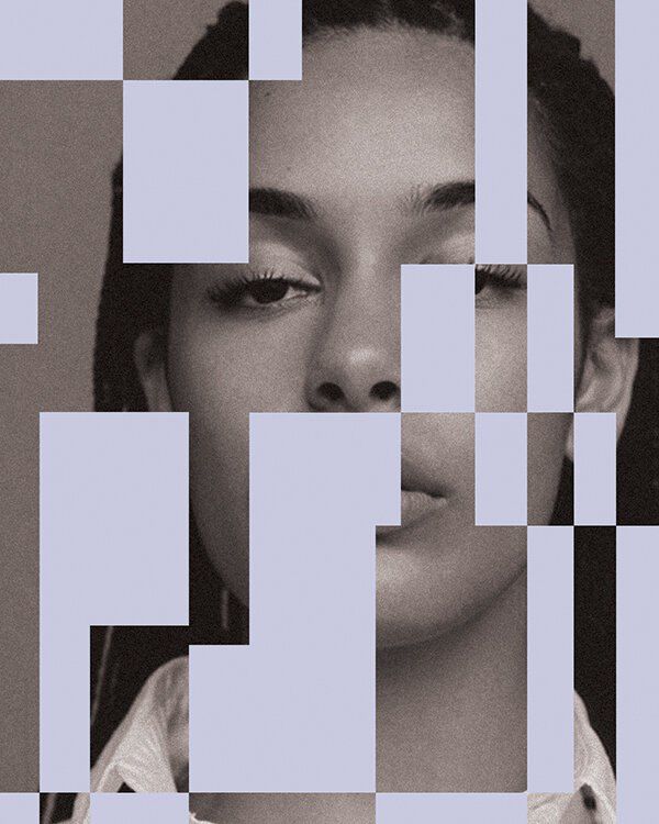 This is a striking monochromatic portrait characterized by aggressive fragmentation and pixelation, transforming the subject's face into a mosaic of geometric blocks. The visual language combines organic human features with harsh digital artifacts, creating a modern and unsettling texture.