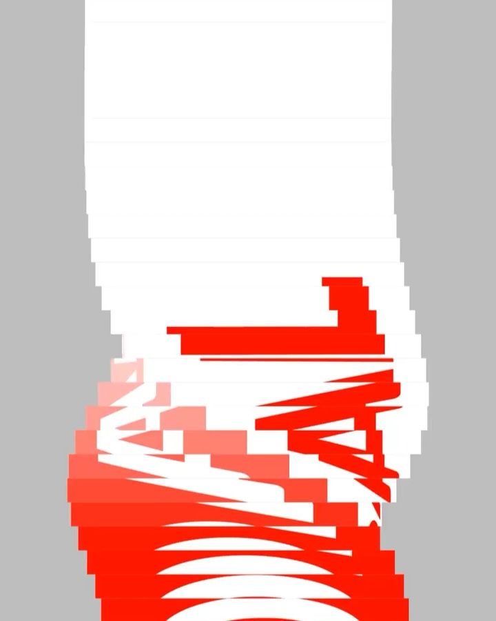 A bold, geometric abstract composition featuring fragmented red and white shapes arranged vertically, creating a sense of dynamic movement and visual tension. The design employs a stark contrast between the vibrant red elements and clean white negative space, set against a neutral gray border that frames the composition.