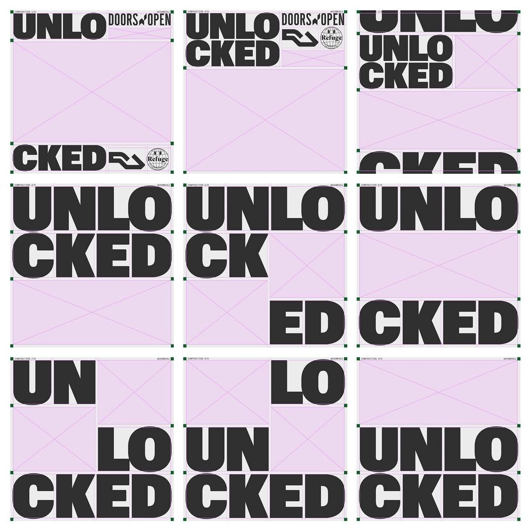This image is a typographic exploration focusing on the word 'UNLOCKED' fragmented across various layouts and scales. It utilizes a stark, high-contrast black and white palette with a soft lavender or pink background tint, creating a clean yet slightly playful visual rhythm.