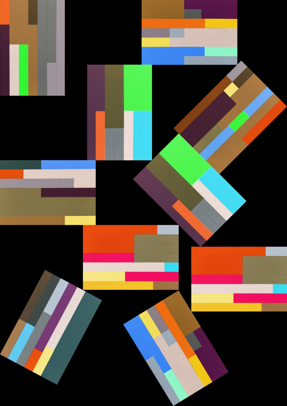 This is an abstract composition characterized by fragmented geometric blocks of color scattered across a stark black background. The visual language relies heavily on color blocking and varied rectangular and diamond shapes to create a dynamic, modern texture. The overall feel is structured yet chaotic, inviting the viewer to explore the interplay between solid color fields.