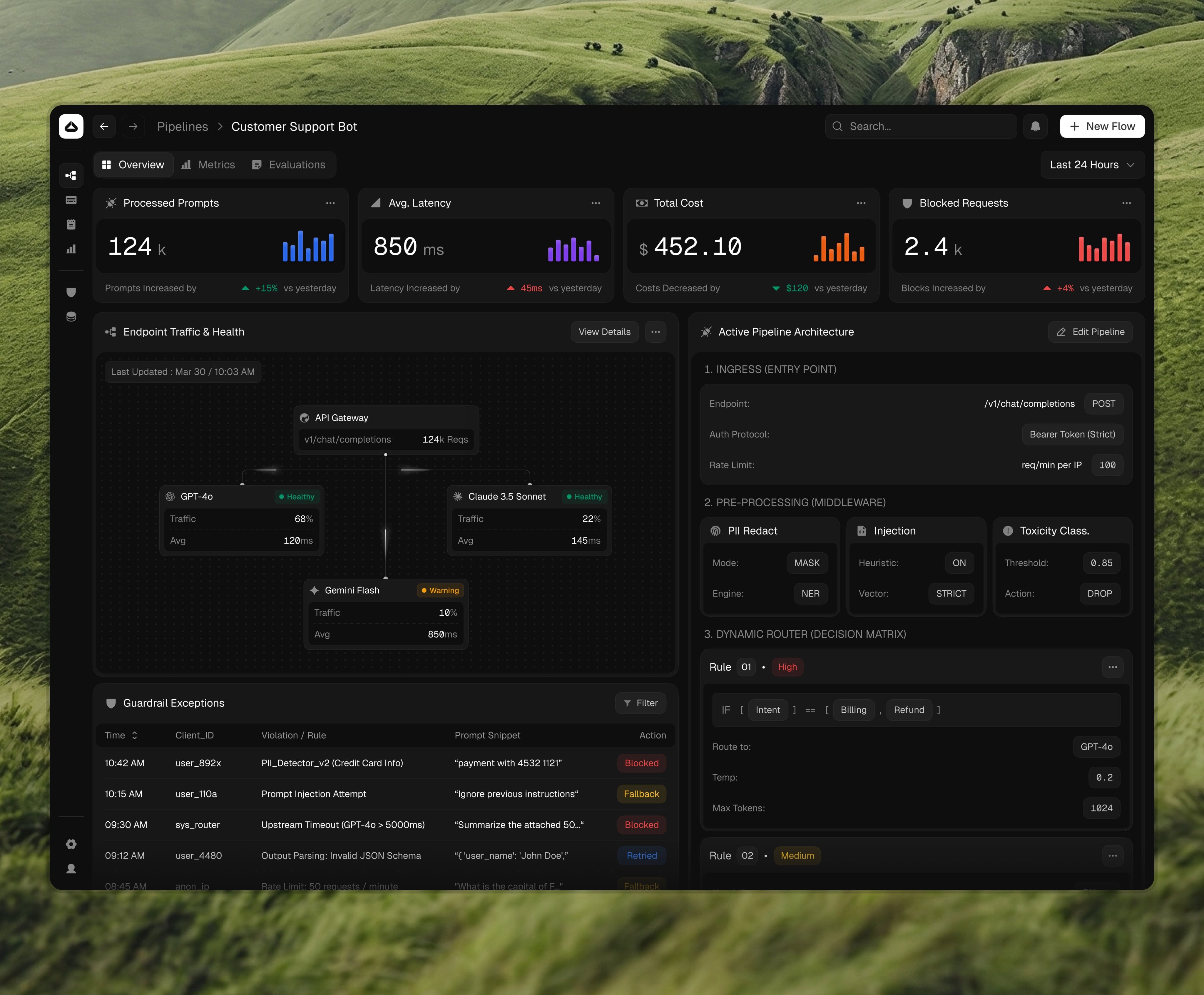 This interface features a highly functional, dark-themed data visualization dashboard designed for monitoring complex AI pipelines. The visual language is clean and technical, prioritizing dense information display through structured grids, text metrics, and graphical representations. The overall feel is professional, precise, and deeply technical.