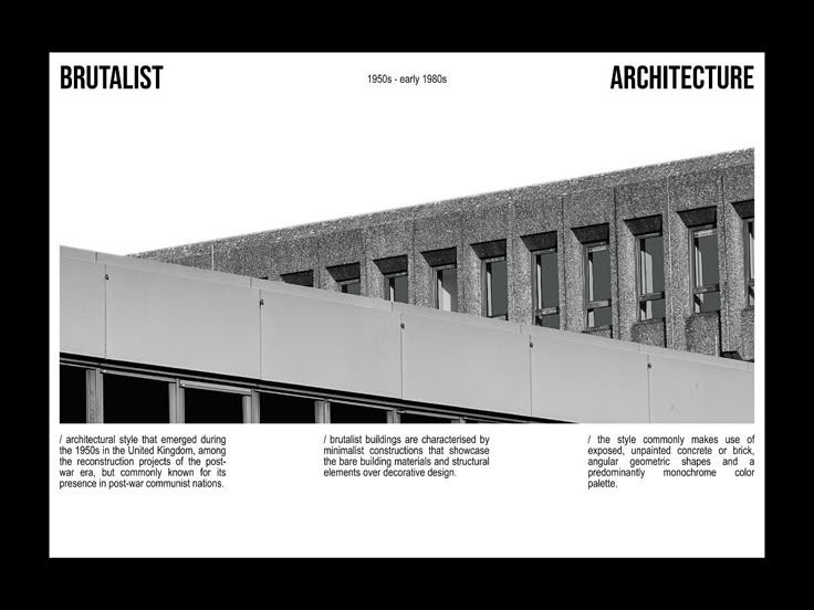 This slide presents a stark visual study of Brutalist architecture, showcasing monolithic concrete structures and repetitive geometric elements. The design emphasizes raw materiality and severe functionalism typical of mid-to-late 20th-century modernist movements.