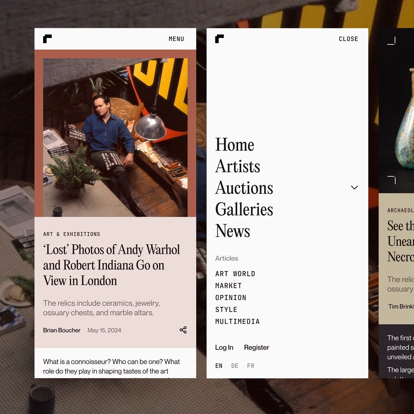 This design utilizes a dark, high-contrast editorial style, pairing moody photographic elements with clean, minimal navigational text. The visual language is sophisticated and serious, employing negative space effectively to focus attention on the featured content.