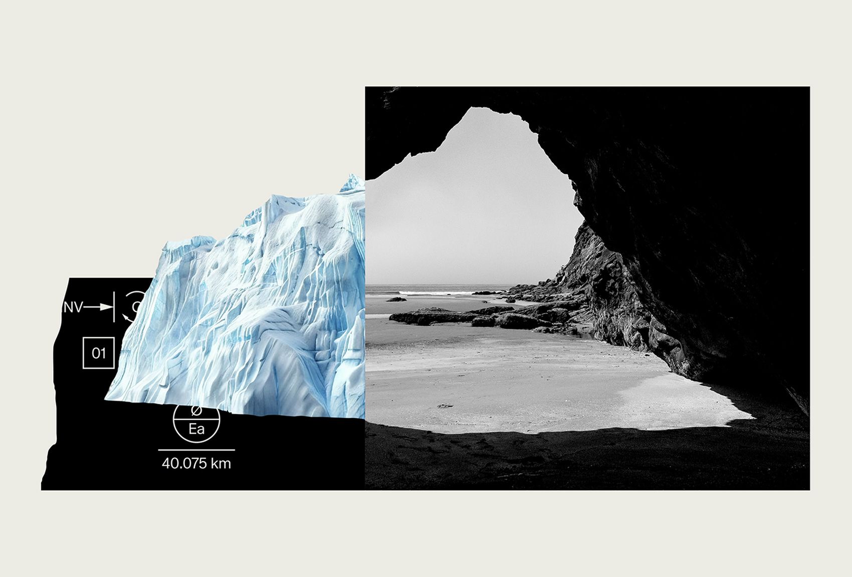 This design utilizes high contrast and juxtaposition to present geological imagery, pairing the fragile texture of glacial ice with the immense scale of dark rock and seascape. The visual language is stark and dramatic, employing negative space effectively to draw attention to both the icy detail and the rugged terrain. The overall feel is scientific, powerful, and deeply atmospheric.
