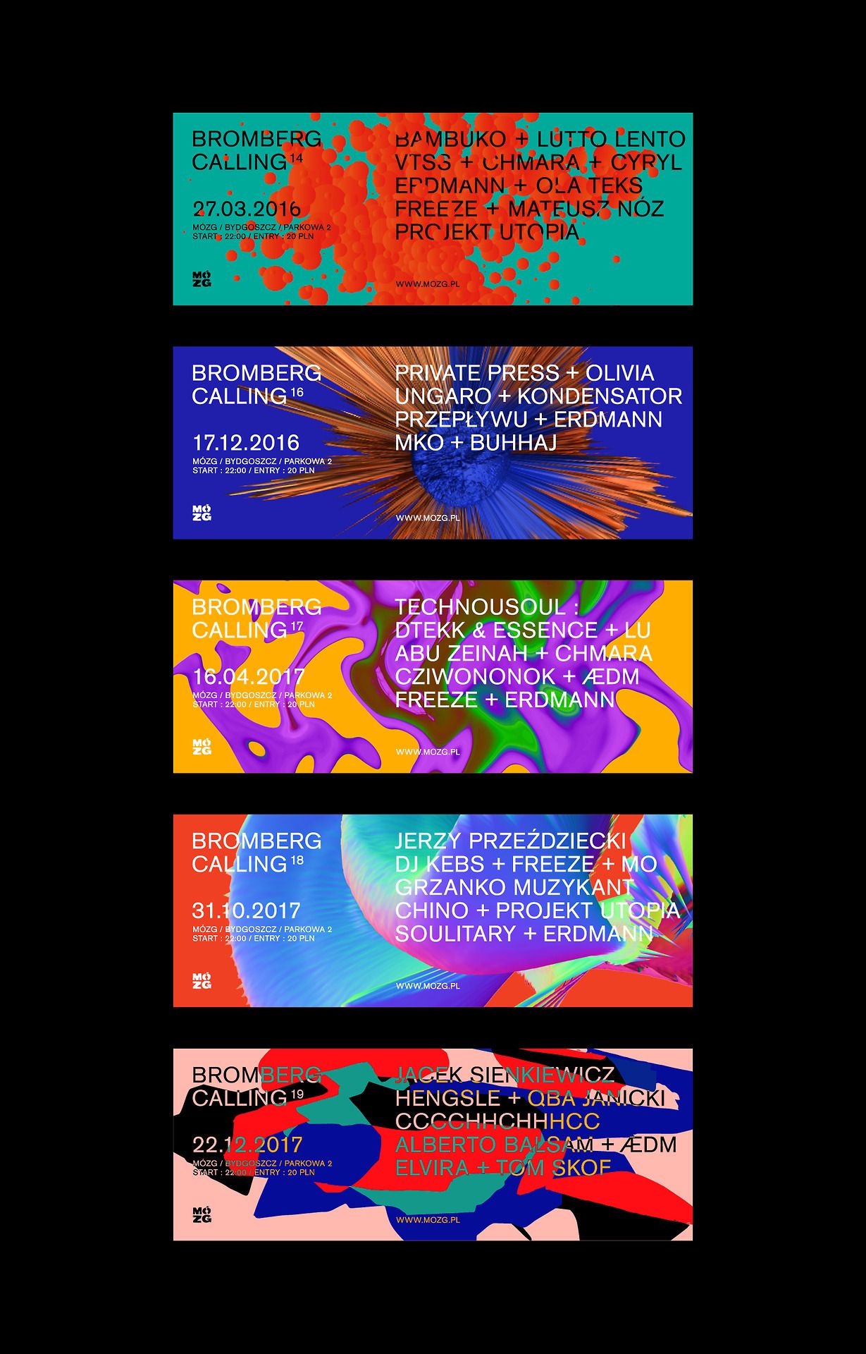 A vibrant series of event promotional banners featuring bold, abstract liquid and organic shapes with high-contrast color blocking. The design employs a contemporary digital aesthetic with overlapping translucent forms and dynamic typography, creating a sense of movement and energy across multiple horizontal compositions.