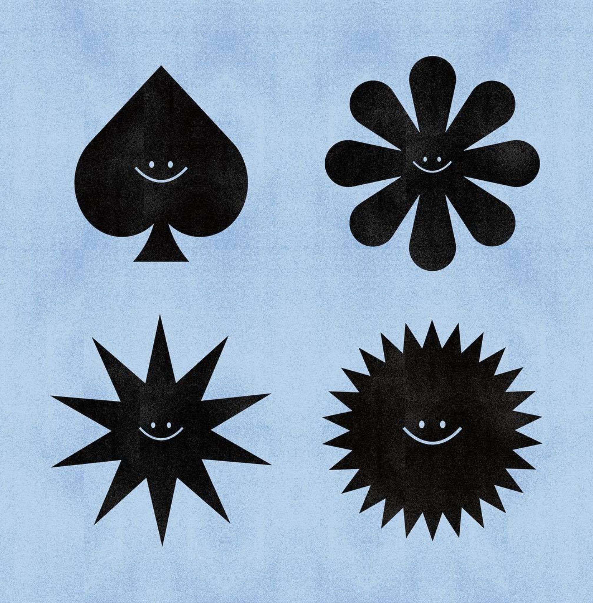 This image presents a set of simple, hand-drawn style icons characterized by high contrast and minimalist line work. The design utilizes smooth, organic shapes combined with a subtle cheerful element—a small smile—to convey friendliness and innocence. The overall visual language is clean, approachable, and highly graphic.