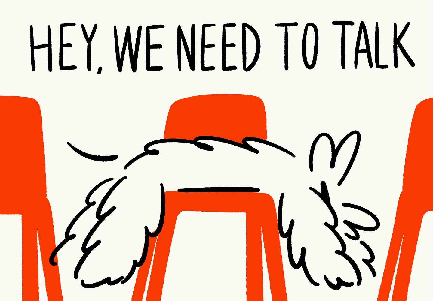 This graphic utilizes a high-contrast, distressed visual language combining stark text with sketchy line drawings. The design conveys an immediate and informal tone, suggesting urgency or a direct call to attention through expressive hand-drawn elements.