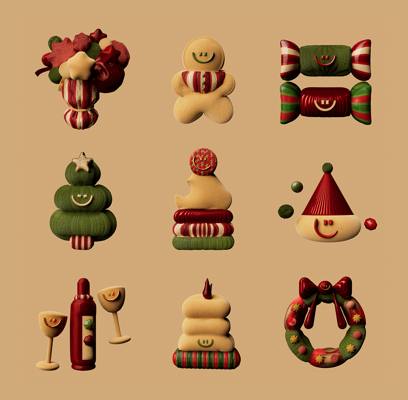 This collection showcases a charming array of handcrafted items, likely food products or seasonal decorative elements, characterized by soft textures and intricate striped patterns. The visual language blends cozy textile work with playful, organic shapes to create a nostalgic and highly tactile aesthetic.