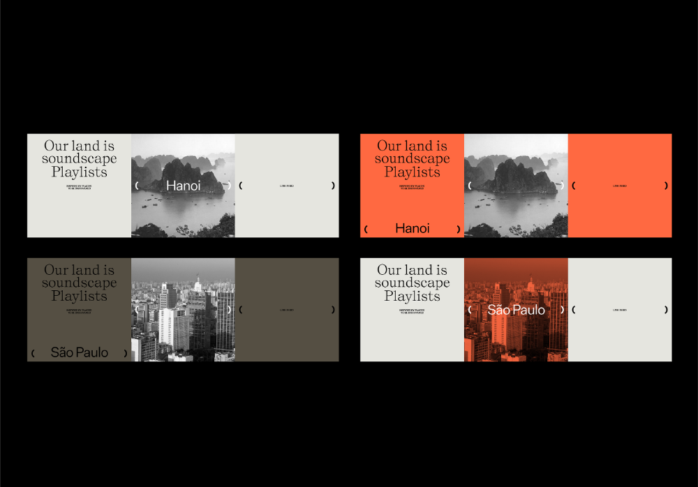 The image presents a minimalist, horizontally segmented visual display, likely for a media or music platform showcasing location-based soundscape playlists. It uses subtle photography juxtaposed with clean, block color fields to create a sophisticated and evocative mood.