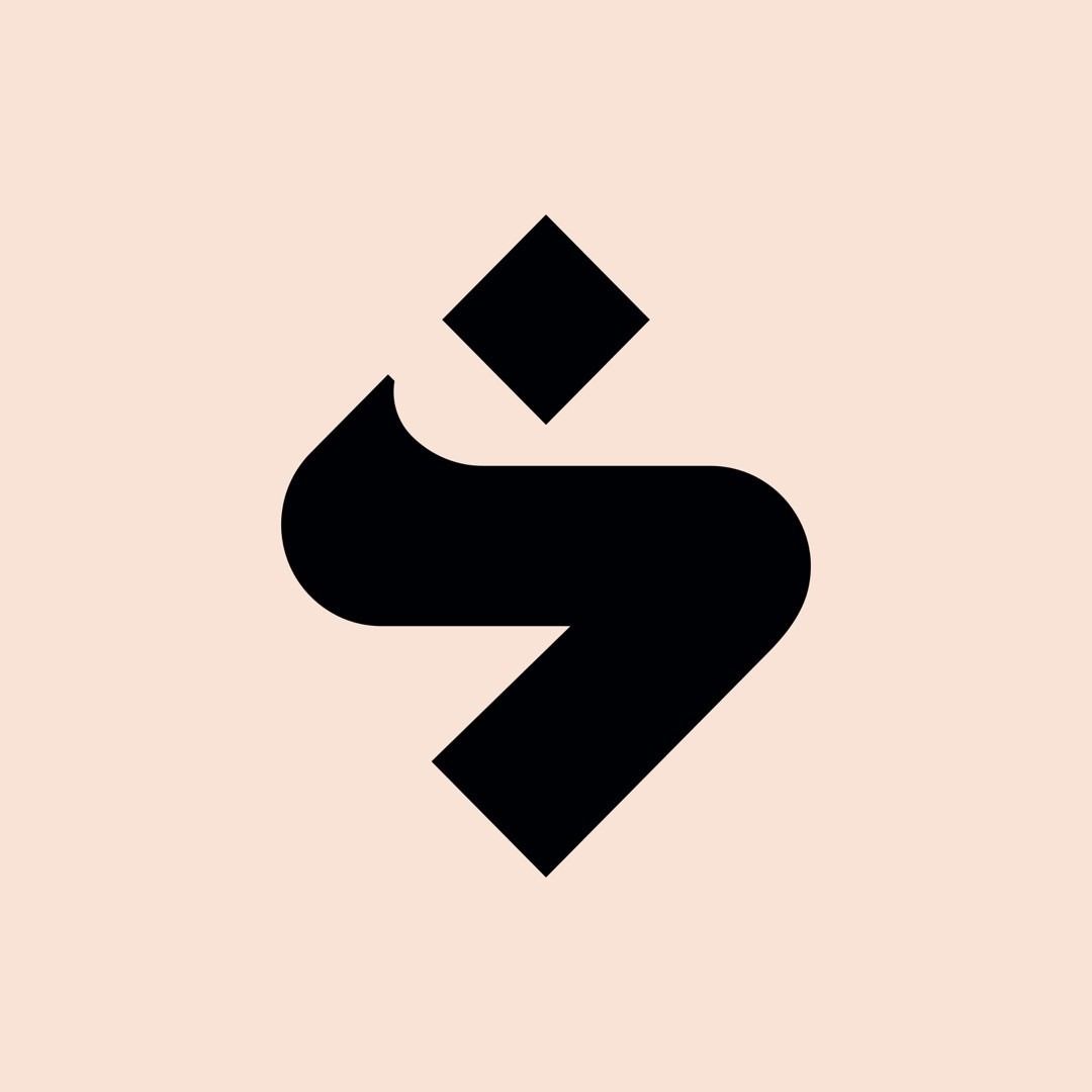 A minimalist geometric icon featuring a stylized arrow or pointer symbol composed of bold black shapes against a warm beige background. The design uses simple, rounded forms and rotated rectangles to create a dynamic, forward-moving gesture with a modern, approachable aesthetic.