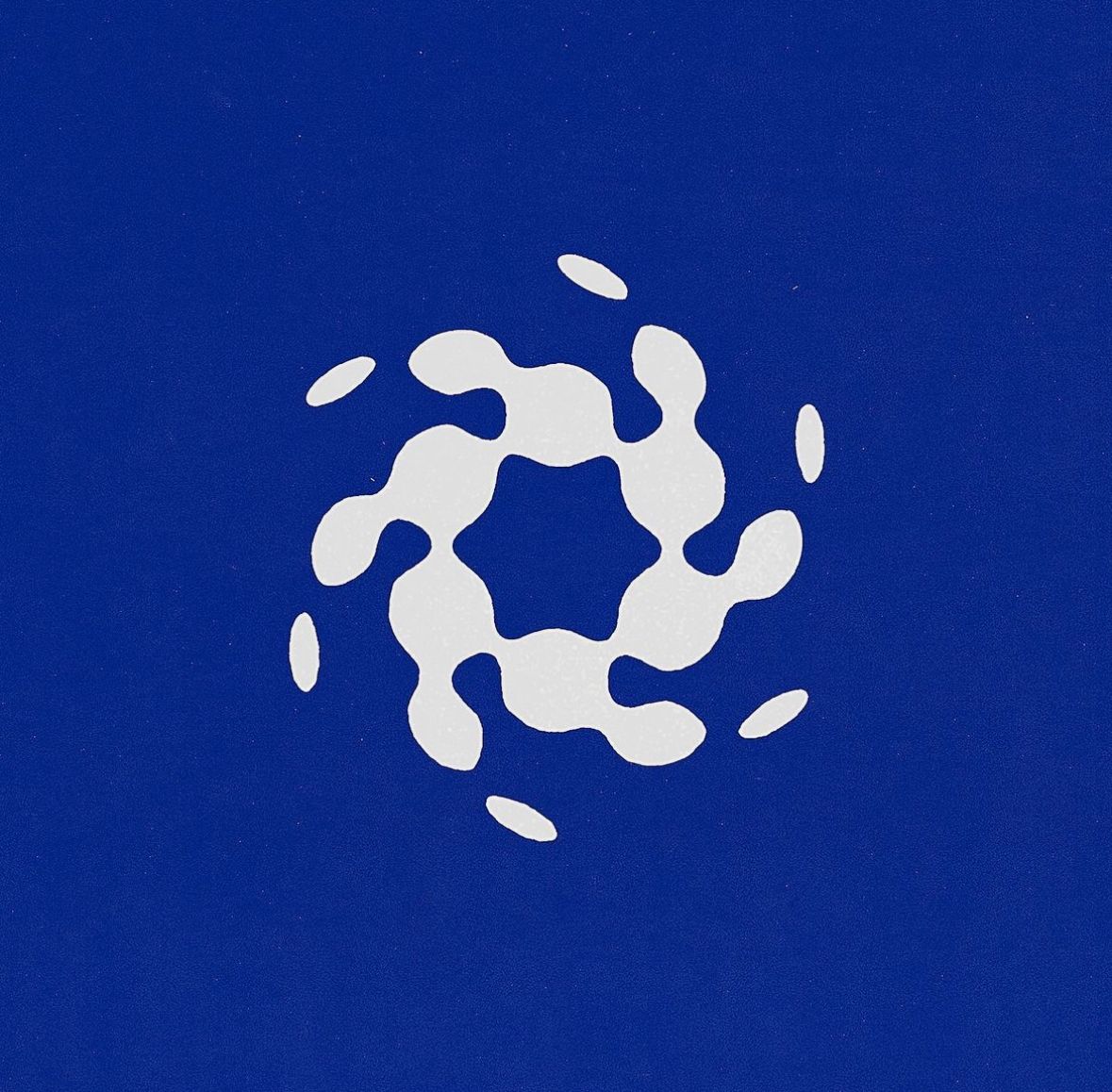 A minimalist geometric design featuring an abstract circular arrangement of organic, rounded shapes in cream white against a deep cobalt blue background. The composition creates a sense of movement and interconnection through its flowing, blob-like forms arranged in a radial pattern.