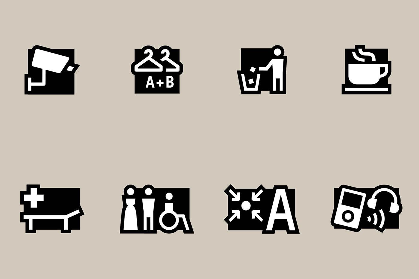 A minimalist icon set featuring eight utility and service-related symbols rendered in bold black silhouettes against a neutral beige background. The design employs a clean, geometric approach with consistent stroke weights and high contrast for maximum legibility at small scales.