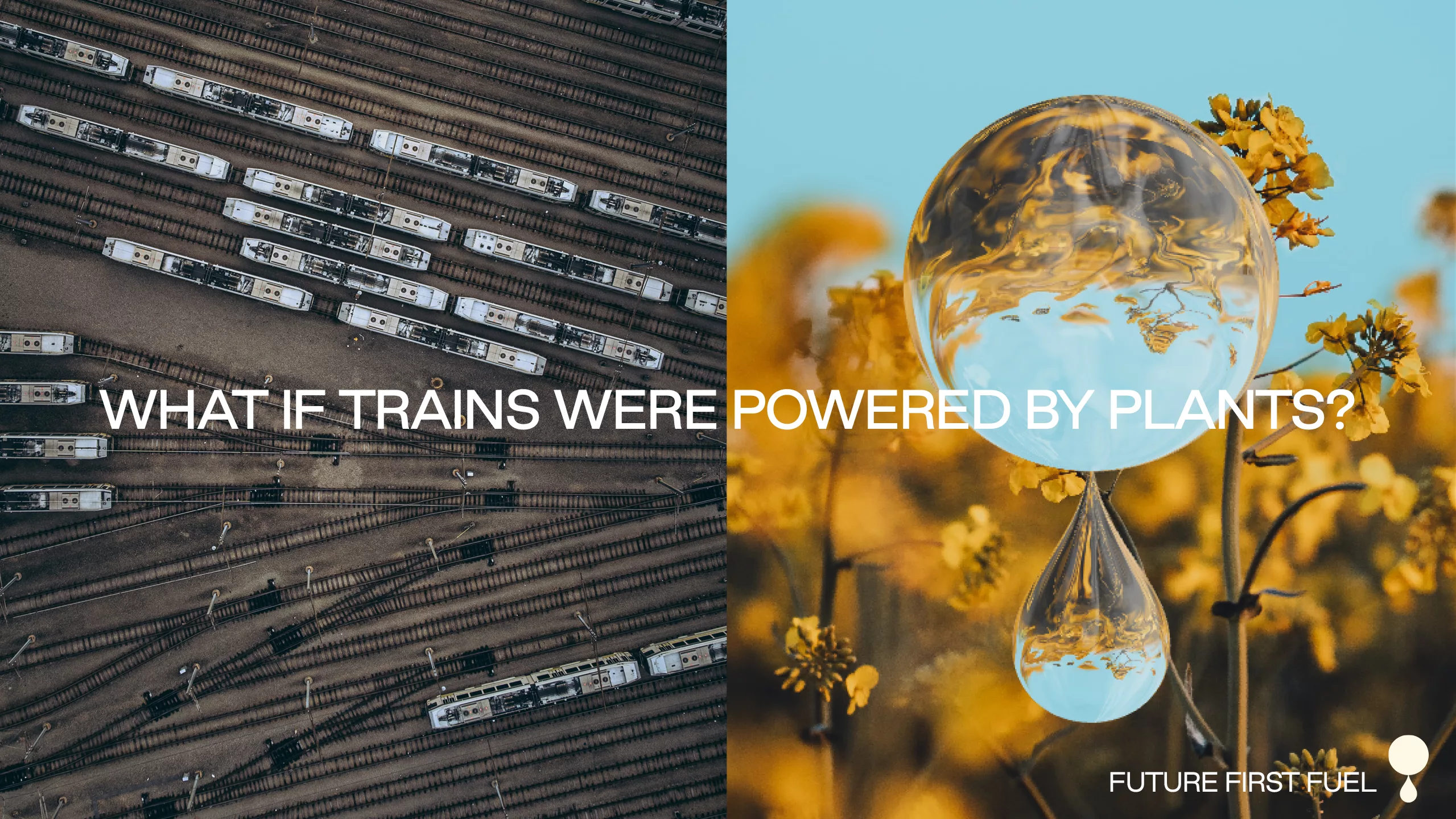This is a conceptual split image juxtaposing heavy industrial infrastructure (train tracks) with delicate organic elements (flowers reflected in water). The visual language uses high contrast between gritty textures and soft, luminous natural tones to explore themes of innovation and sustainability.