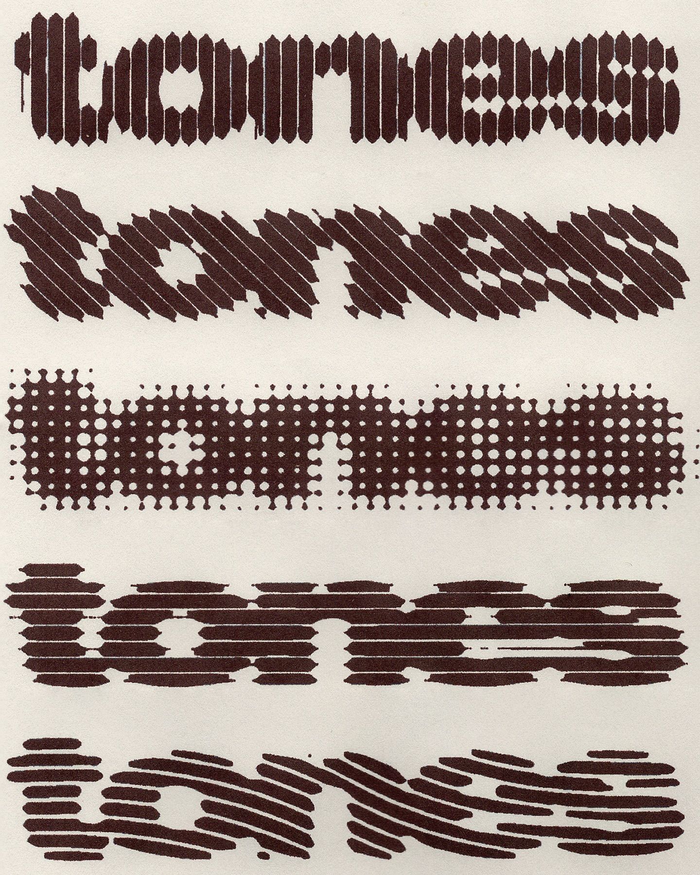 A systematic typographic exploration featuring five variations of the word 'address' rendered through different linear and dotted pattern techniques. The design demonstrates experimental letterform construction using horizontal lines, dashes, and dots in a monochromatic brown palette against a cream background, creating a rhythmic visual study of legibility and abstraction.