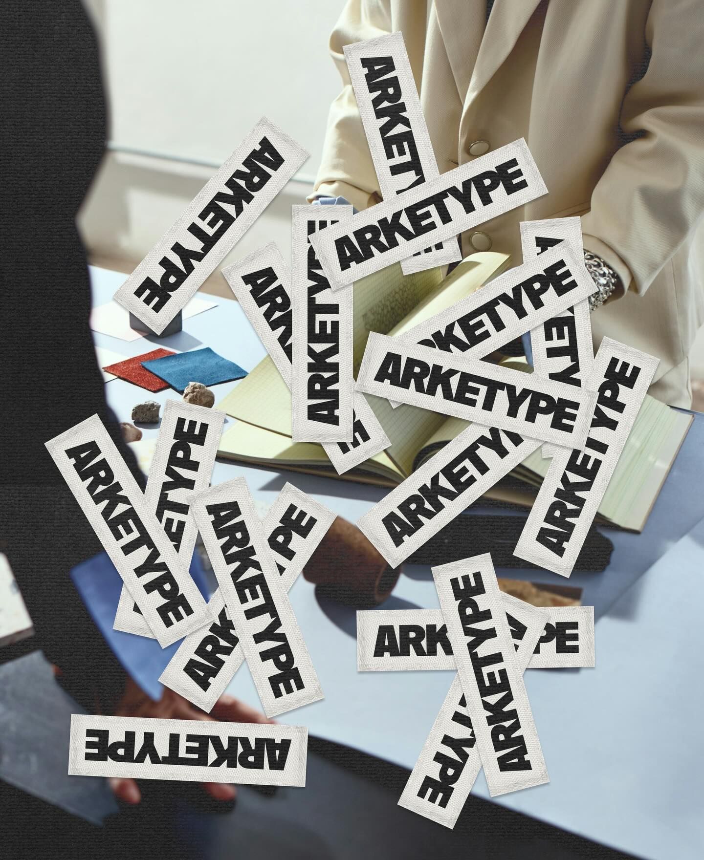 A dynamic, experimental design featuring scattered white labels with bold black typography spelling 'ARKETYPE' in various fragmented arrangements. The composition captures a playful, deconstructed aesthetic with physical paper elements held in hands, creating a tactile, three-dimensional presentation that emphasizes typography as a primary design element.