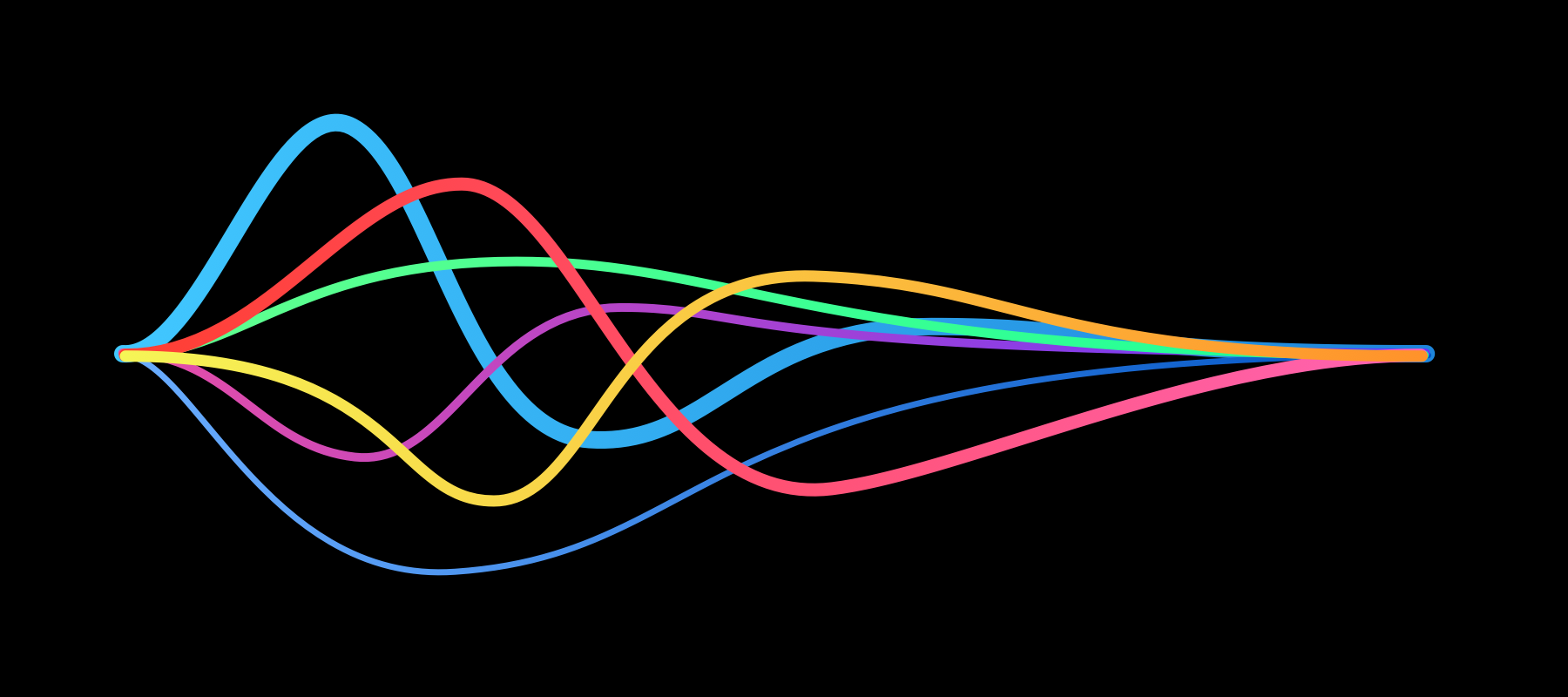 This abstract visualization utilizes fluid, continuous line art to convey movement and rhythm against a stark black background. The design emphasizes organic flow and the interplay between various hues, creating a dynamic yet serene visual experience. It functions as a compelling demonstration of wave-like motion and color transition.
