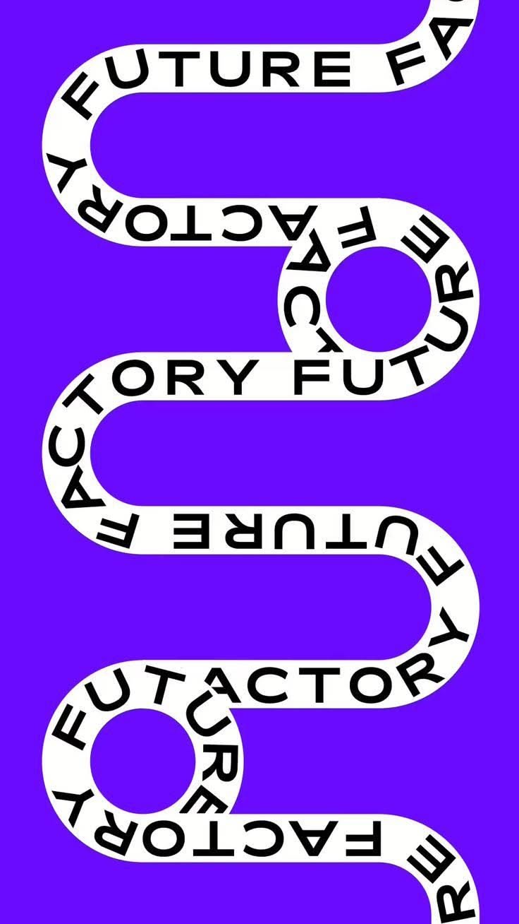 This is a visually dynamic typographic composition where the words 'FUTURE FACTORY' are rendered in a continuous, serpentine line against a vibrant purple background. The design emphasizes movement and continuity through the winding path of the text.