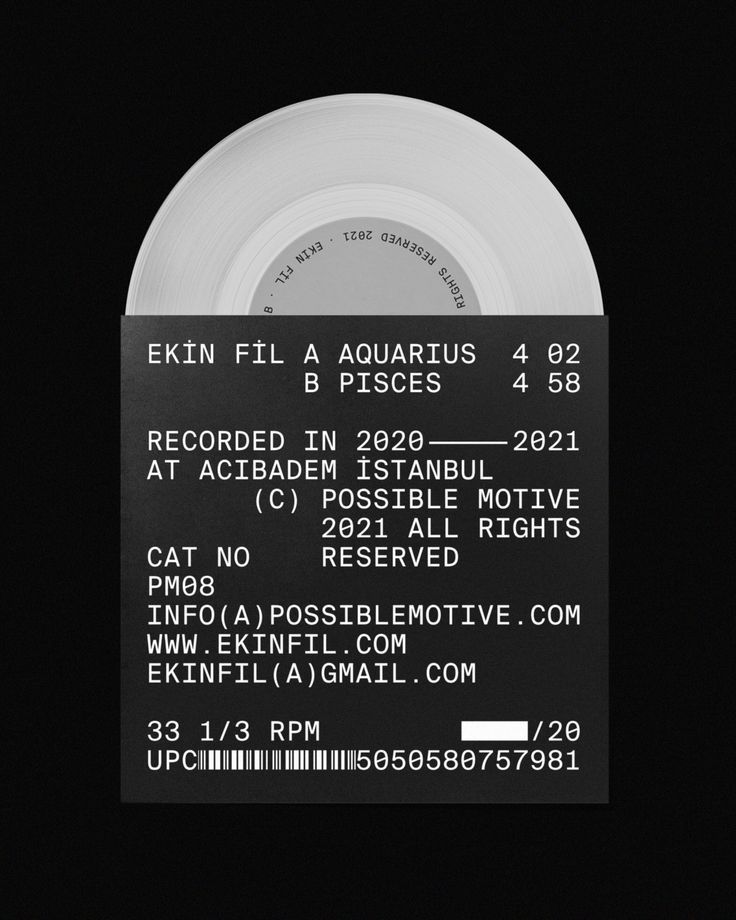 The image presents a stark, minimalist design typical of a vinyl record label or pressing information. It uses high contrast between black text and the white disc surface, conveying a sense of archival documentation and professional production.