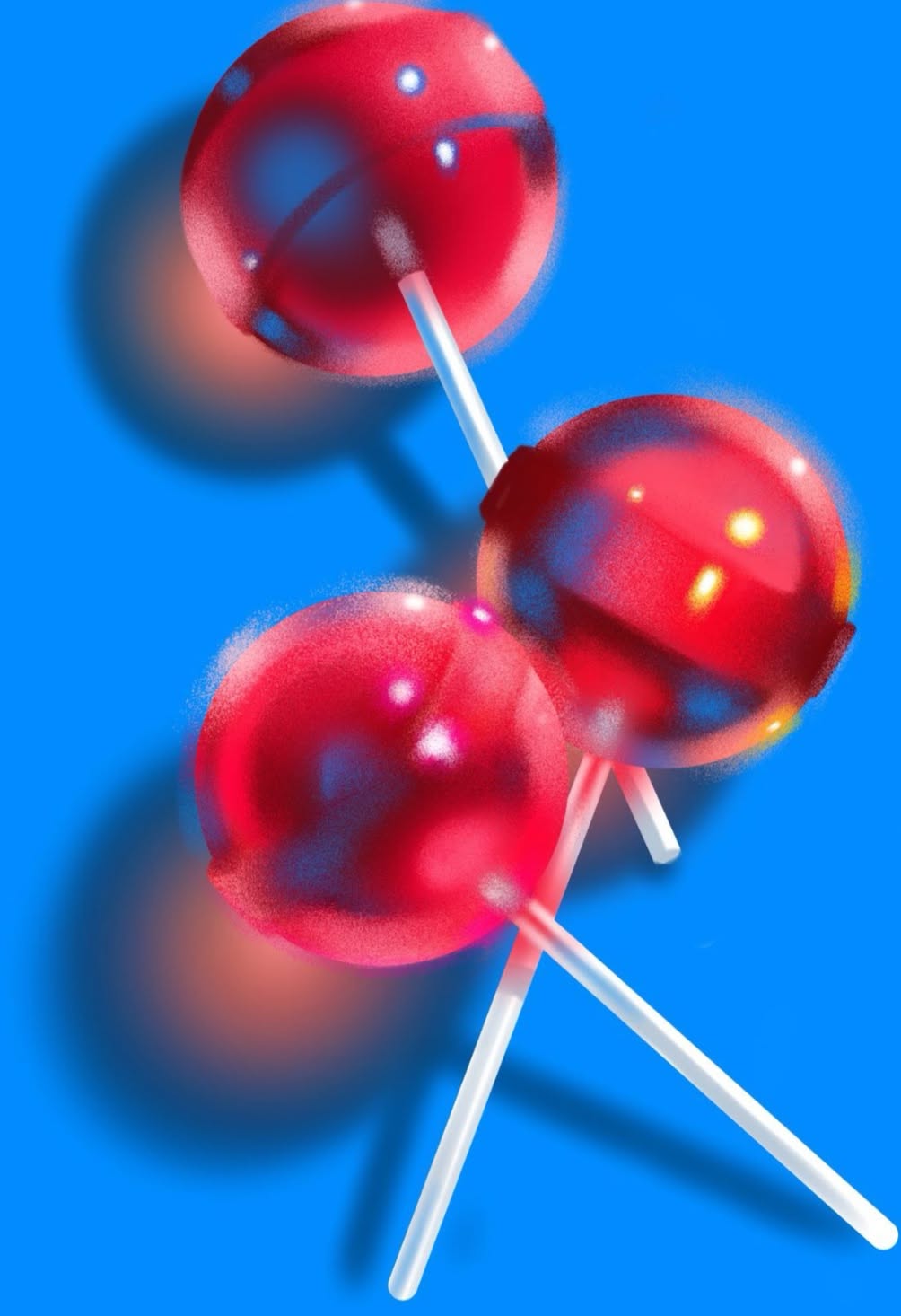This image showcases a vibrant abstract representation of linked spherical forms rendered with strong specular highlights. The design utilizes high contrast between the deep red spheres and the cool blue background, emphasized by soft ambient lighting and delicate shadows.