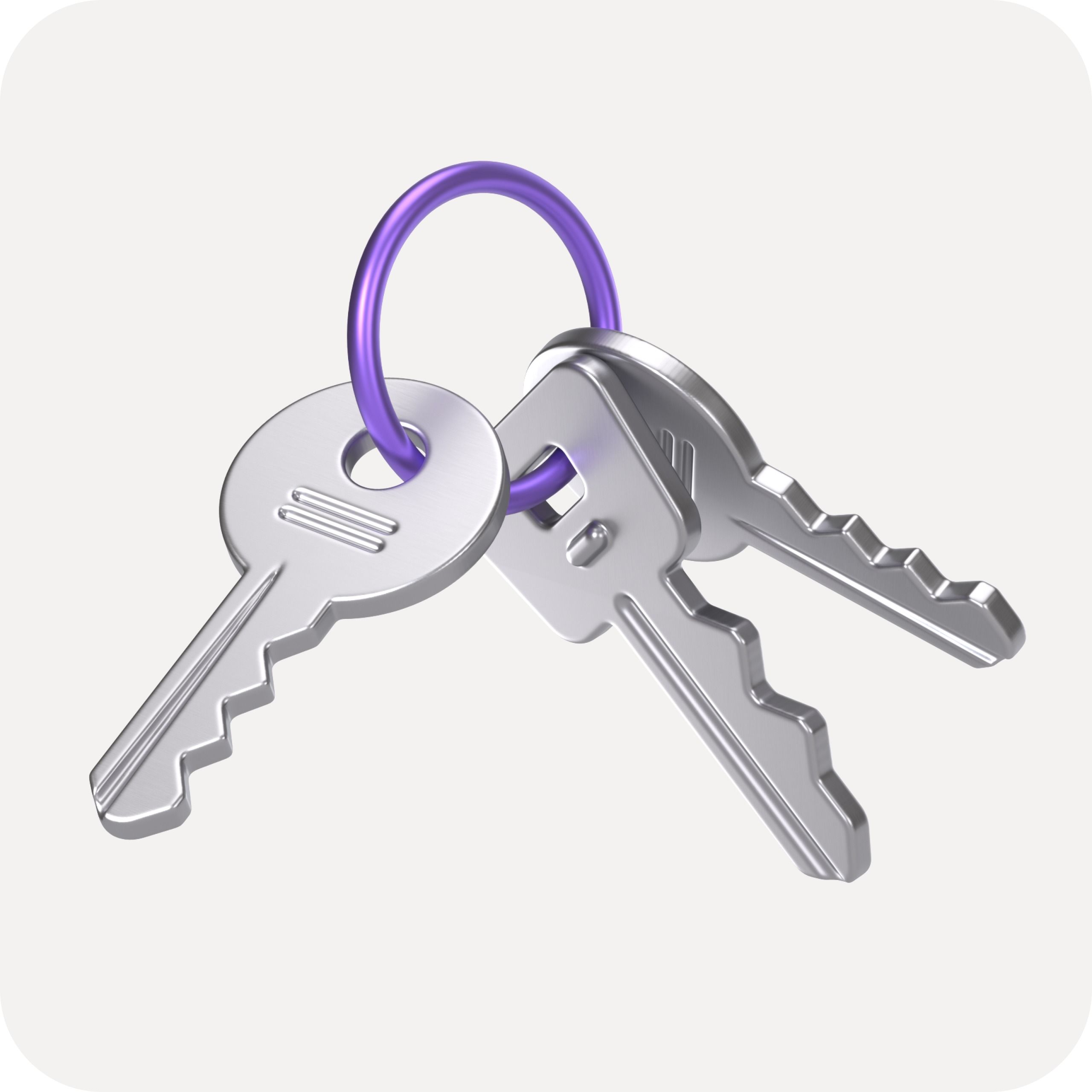 This image features a highly rendered metallic key, showcasing sharp detail and reflective surfaces contrasting against a soft purple keyring. The visual language is clean and focused, emphasizing texture and the interplay between cool silver tones and vibrant purple accents. The overall feel is modern, elegant, and slightly intriguing.