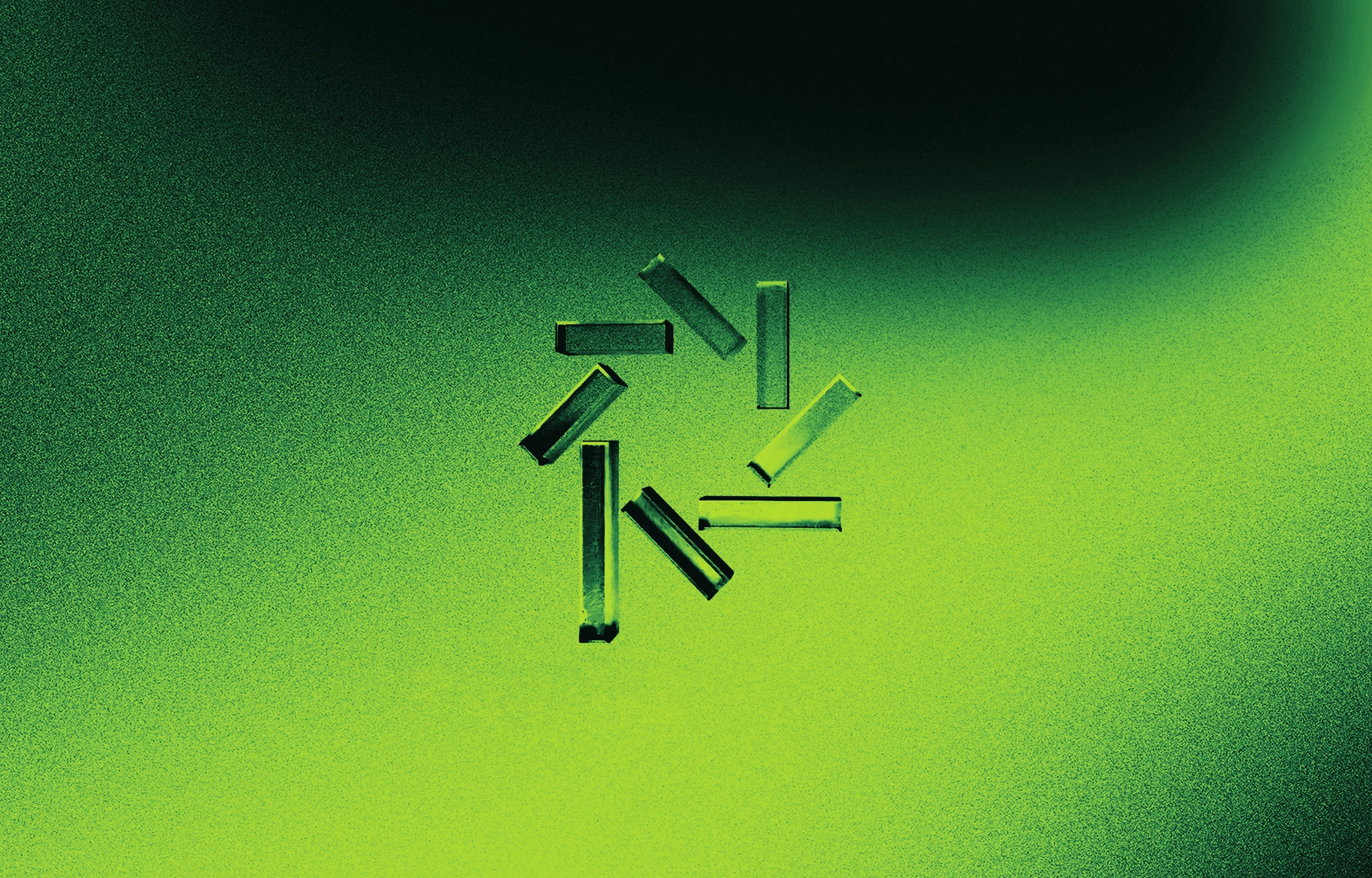 This is an abstract composition featuring sharp, linear geometric elements that appear metallic or translucent, arranged in a dynamic burst against a soft, moody green gradient. The visual language is clean and modern, emphasizing precision and subtle depth through light and shadow play.