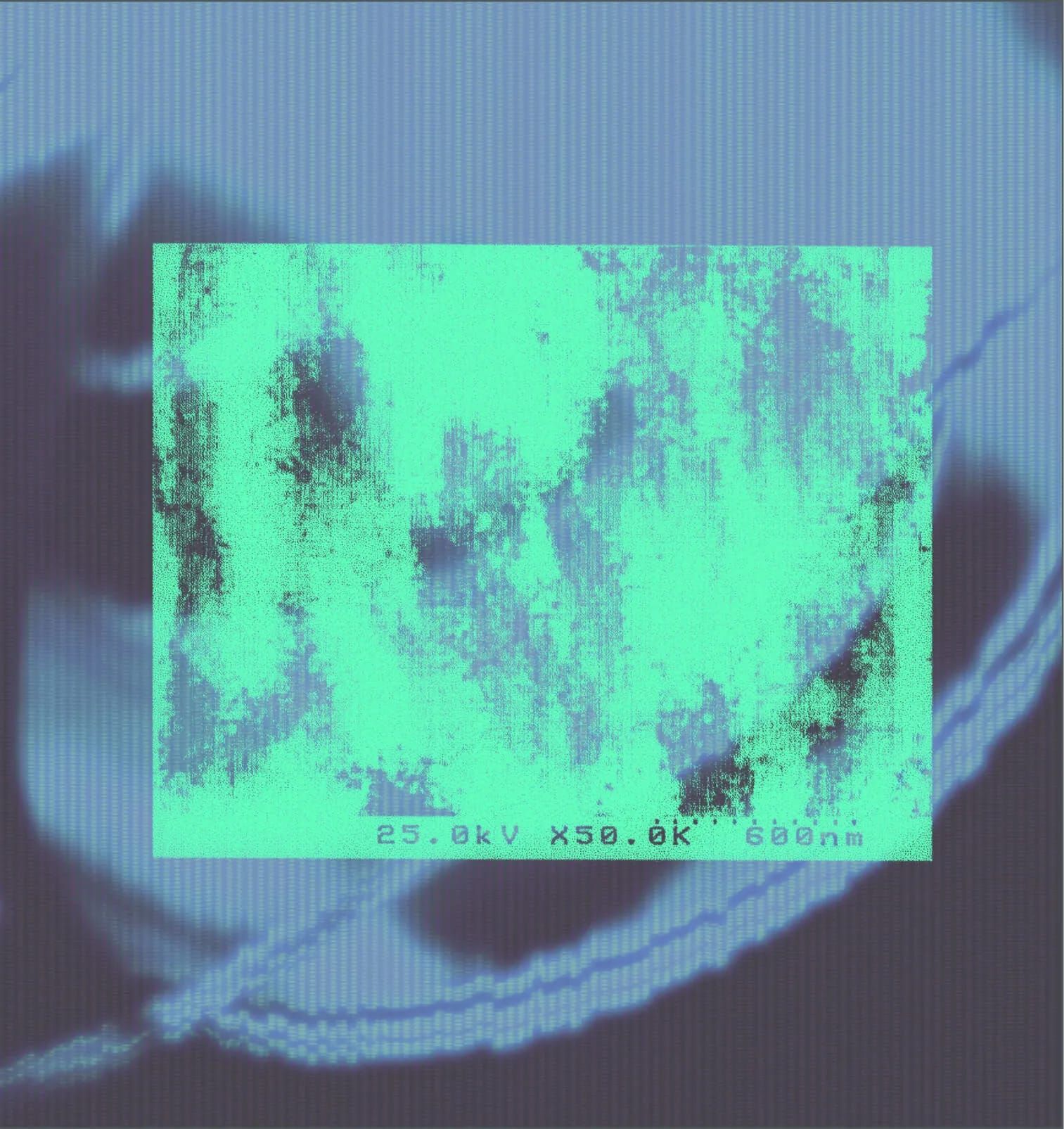 This image is a high-magnification micrograph, characterized by subtle textural details and a stark contrast between the bright cyan structures and the dark background. The visual language is purely technical, focusing on revealing microscopic details within a scientific context.