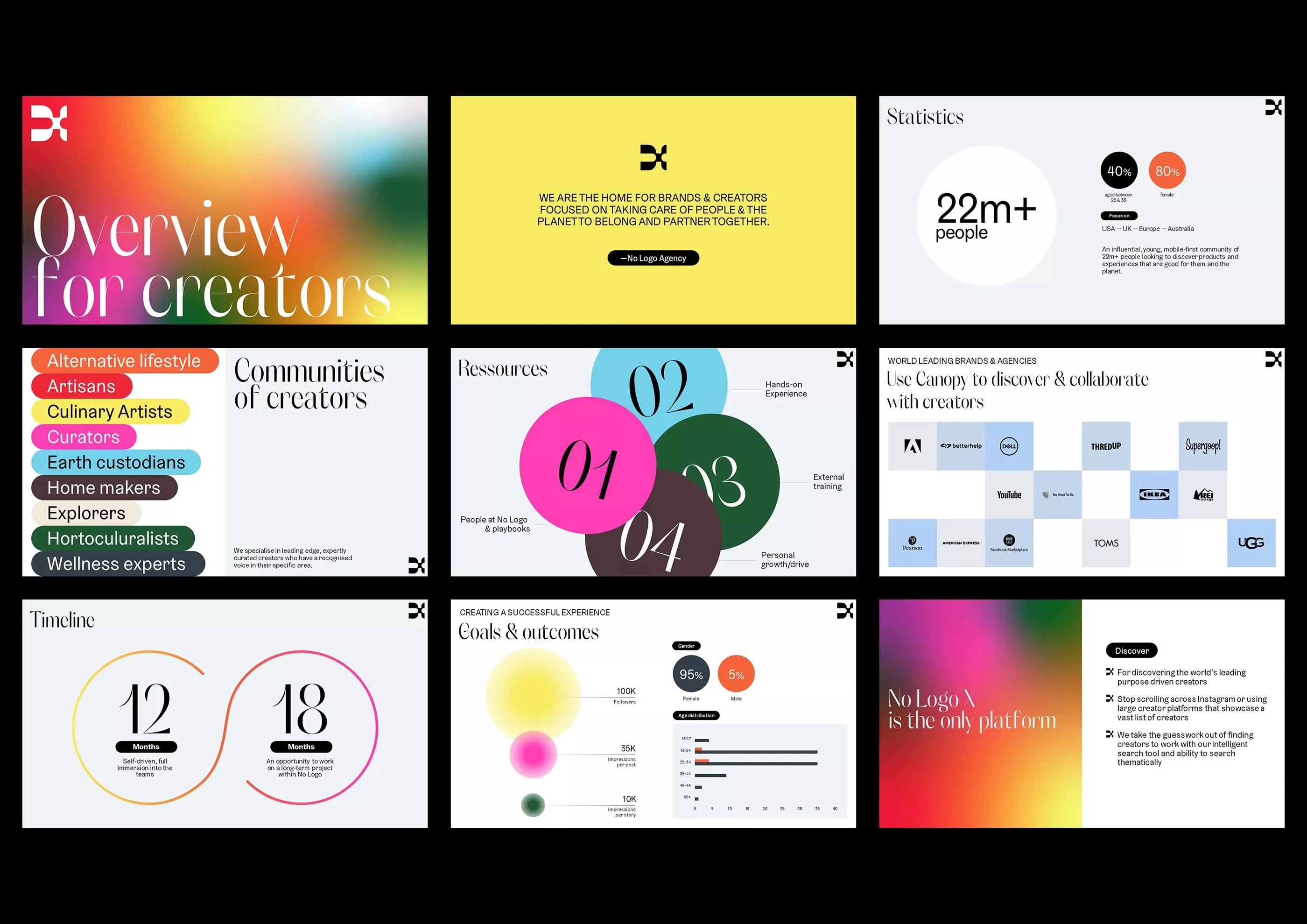 This collection of screens showcases a modern, clean user interface design characterized by vibrant yet balanced color accents and clear data visualization. The visual language is professional and organized, utilizing ample whitespace to ensure readability across various content types. The overall feel is energetic, trustworthy, and focused on creator-centric metrics.