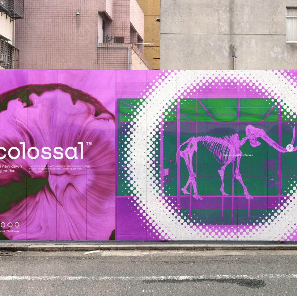 This striking mural employs a surreal and graphic visual language, juxtaposing the organic fluidity of a large flower with the stark structure of an animal skeleton. The design utilizes vibrant color blocking and halftone dot patterns to create depth and texture, resulting in a highly detailed and intriguing piece of street art.