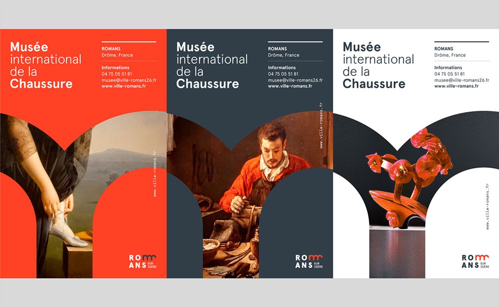 The design employs a strong, modern, and sophisticated aesthetic using a limited color palette dominated by deep reds, blacks/dark grays, and white space. The layout is clean and modular, using large photographic elements juxtaposed with clear informational text to convey a sense of cultural depth and professionalism.