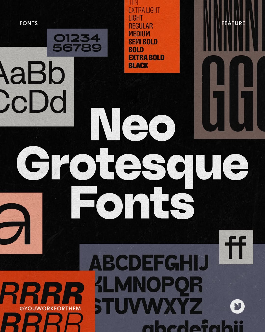 A bold, contemporary typography specimen showcasing a comprehensive neo-grotesque font family. The design employs a high-contrast black background with vibrant accent colors to highlight various weights and styles of the typeface. The layout is deliberately fragmented and layered, creating visual rhythm through overlapping type samples and informational blocks.
