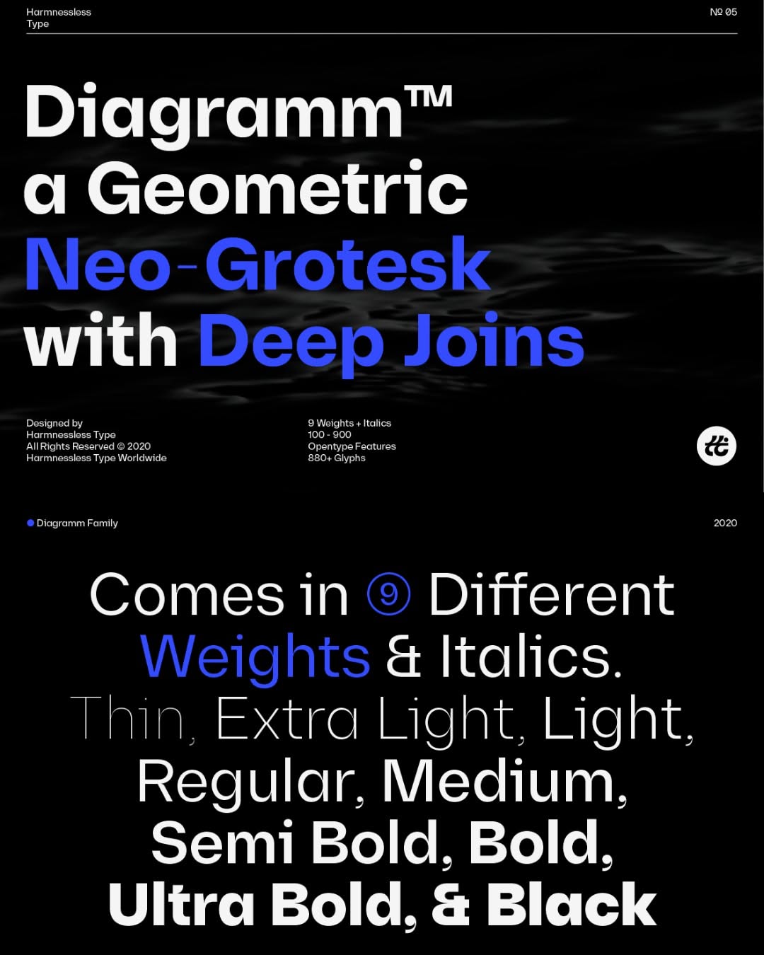 A modern typeface specimen showcasing Diagramma, a geometric neo-grotesque font with distinctive deep joins and extensive weight variations. The design employs a minimalist dark theme with strategic blue accent colors to highlight key typographic features and demonstrate the font's versatility across different weights and styles.