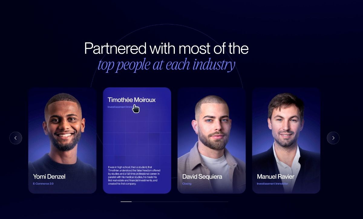 The image presents a professional, modern layout featuring portraits of successful individuals, emphasizing partnership and industry expertise. The design uses a dark, deep blue background contrasted with bright white text and clean, circular framing to convey trust and high-level networking.