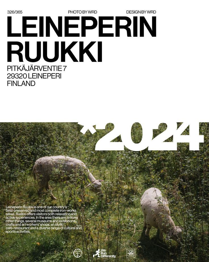 A minimalist Nordic design poster featuring bold typography and a striking nature photograph of sculptural figures in a verdant landscape. The layout combines stark geometric sans-serif lettering with organic imagery, creating a tension between human-made form and natural environment.