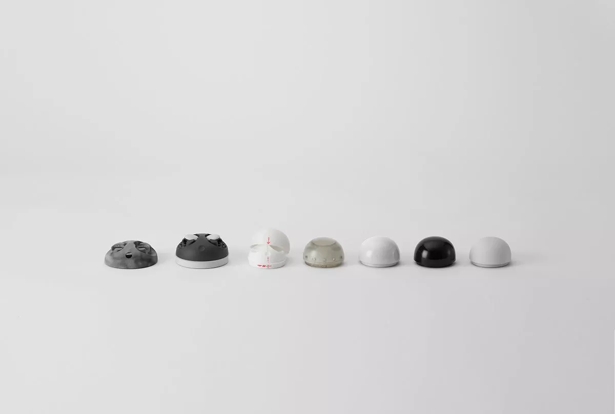This composition showcases a study in minimalist product design, featuring a series of small, smooth, spherical objects arranged linearly. The visual language relies heavily on subtle variations in tone and texture against a clean, monochromatic backdrop to emphasize form and materiality.