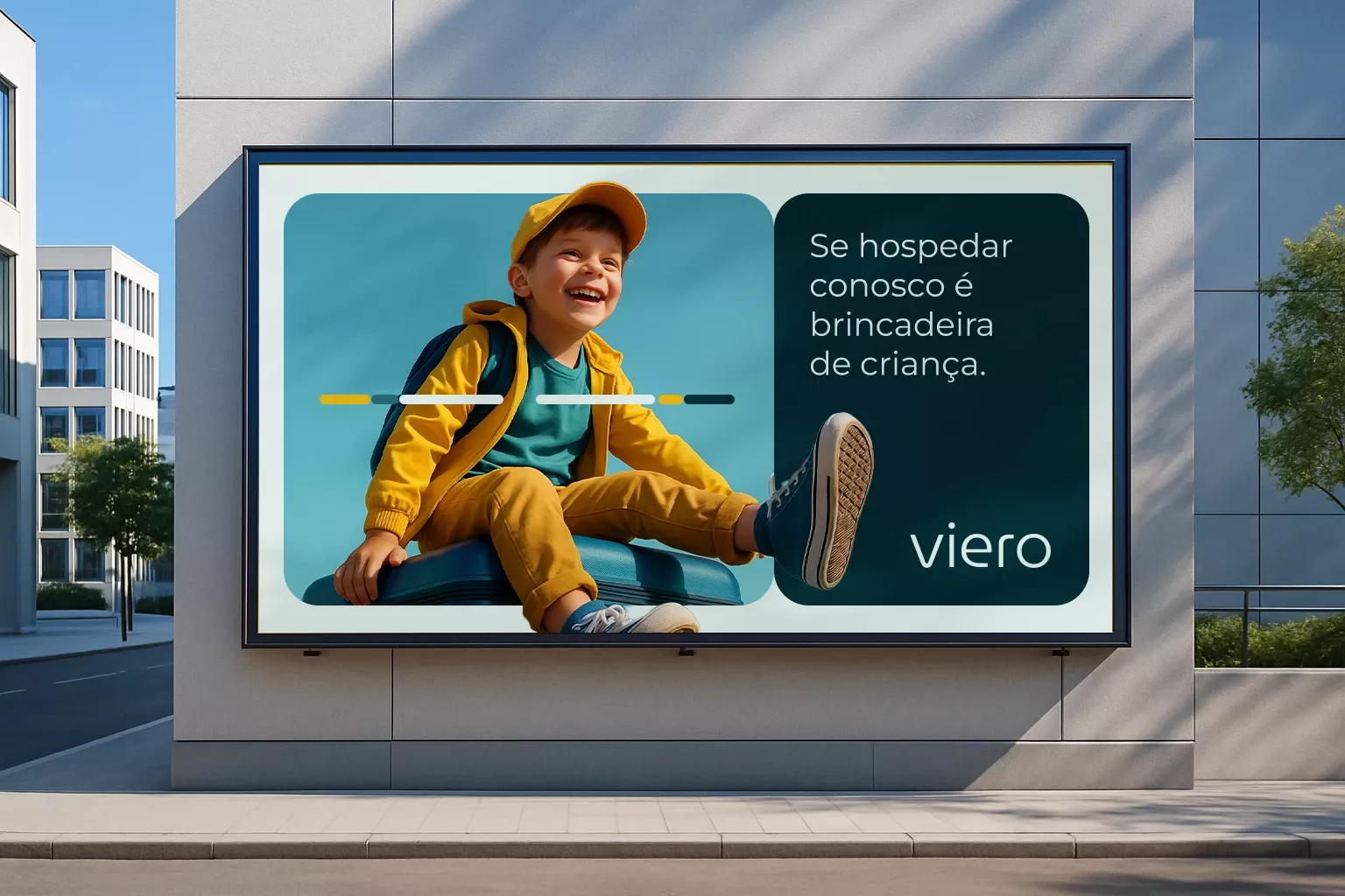 This design effectively blends modern, clean architectural lines with a warm, emotional human element through the display. The visual language is minimalist and high-contrast, using a cheerful child to convey a message of fun and relaxed hospitality.