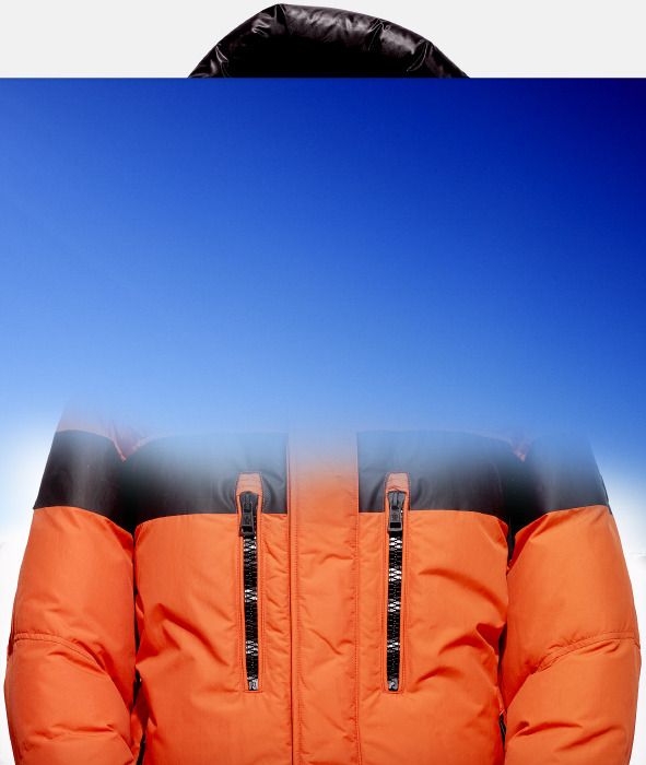 This image captures a close-up of an orange puffer jacket, utilizing bold color blocking and functional detailing against a stark, clean blue sky. The visual language emphasizes warmth, texture (puffer material), and high contrast between the vibrant garment and the cool background.