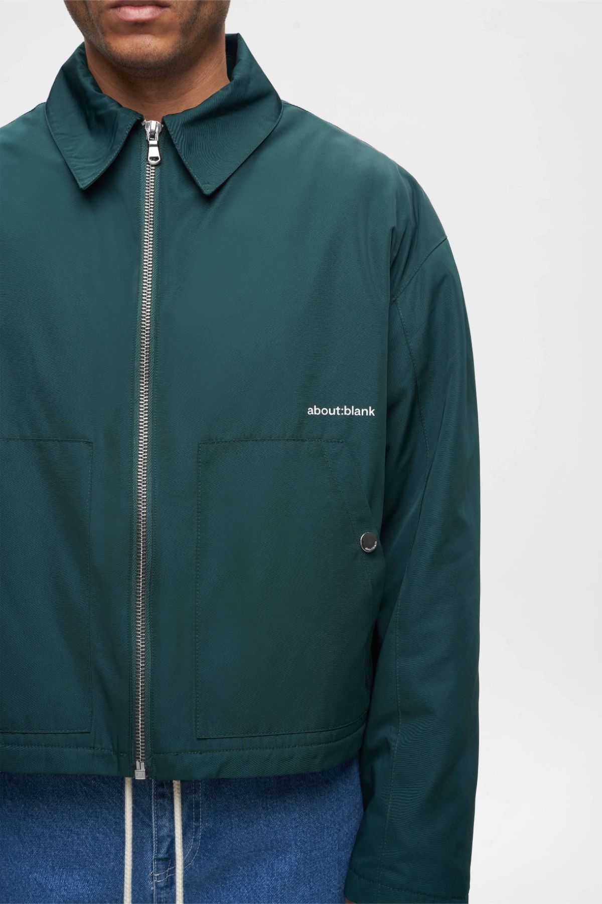 This image showcases a utilitarian jacket characterized by clean lines and functional details like a stand collar and a prominent zipper. The visual language is minimalist, emphasizing structure and durability through the solid color and tailored fit.