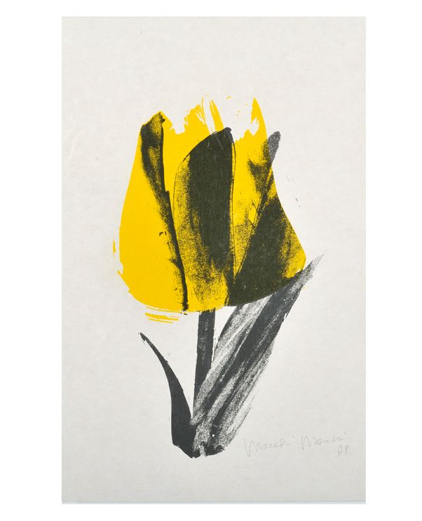 This is a minimalist yet expressive botanical illustration, focusing on the form and texture of a single yellow tulip rendered with bold, gestural brushstrokes. The design balances stark contrast between the vibrant yellow and deep black/grey tones against a neutral white background.