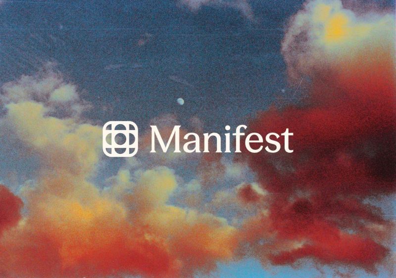 The image features a dramatic, painterly sky background with vibrant clouds contrasting against a dark blue upper section. A clean, modern white logo with the word 'Manifest' is centrally placed, creating a juxtaposition between organic texture and minimalist typography.