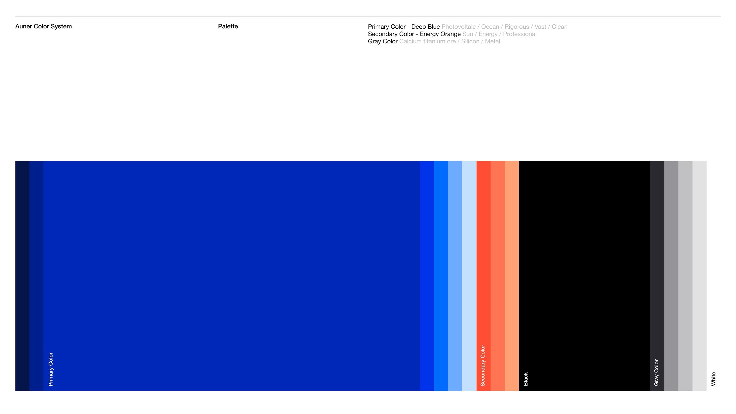This image presents a highly structured and clean color palette display, utilizing contrasting cool blues and warm oranges against neutral grays. The visual language is strictly segmented and academic, emphasizing clarity and defined transitions between color families.