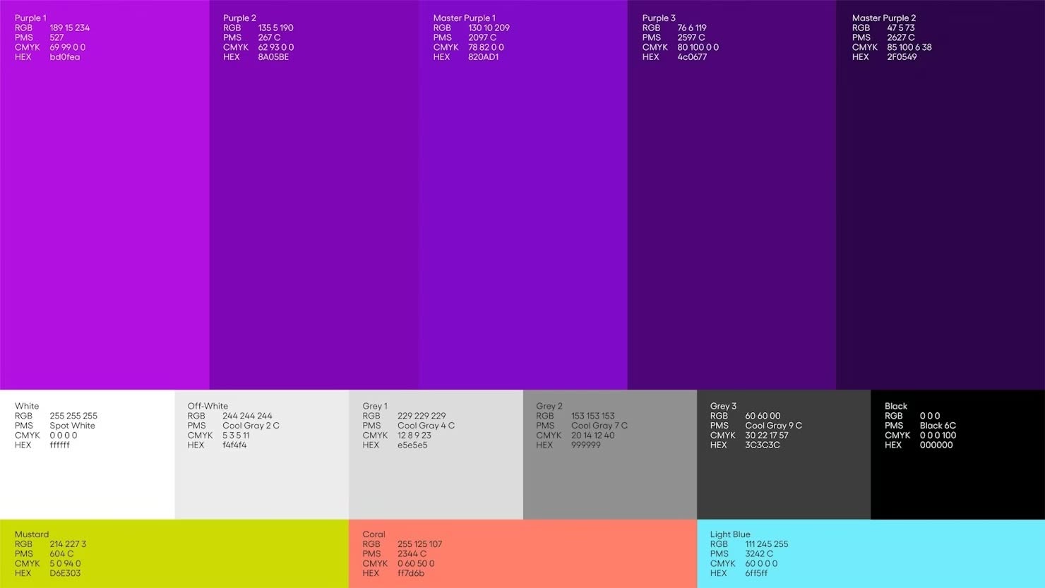 This image presents a highly organized technical palette chart, showcasing various shades of purple and related colors using standard printing metrics like RGB, CMYK, and HEX codes. The visual language is strictly functional and precise, designed for color matching and technical reference.