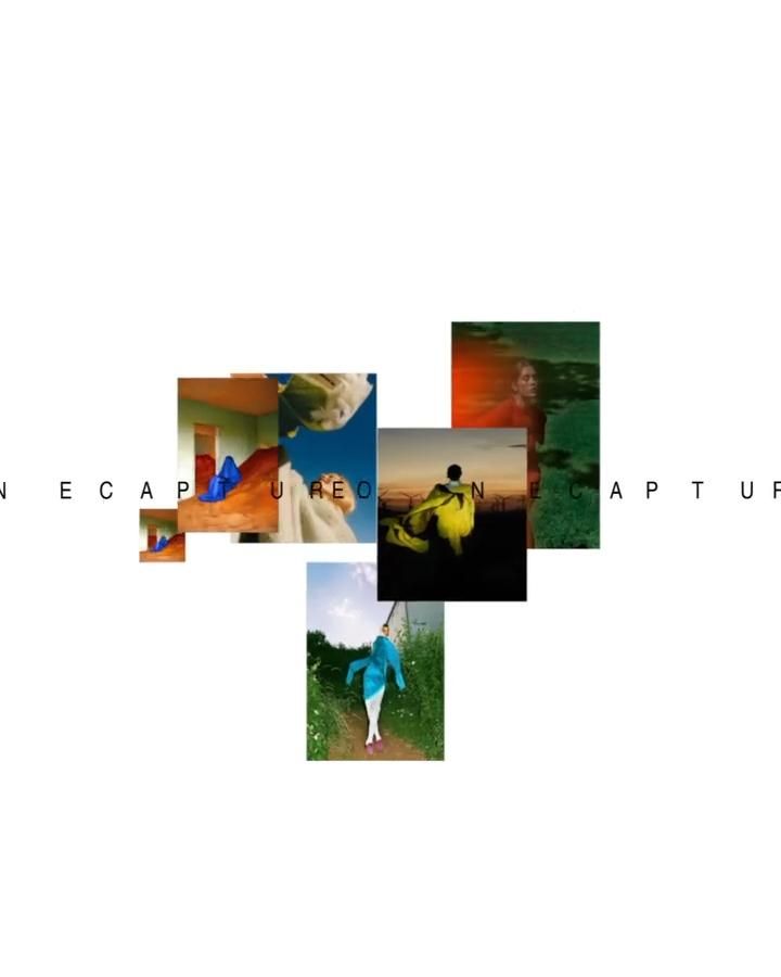 This design is an experimental photographic collage juxtaposing fragmented text and portraiture against natural landscapes. The visual language is stark and asymmetrical, using varied photographic crops to create a disjointed yet cohesive mood.