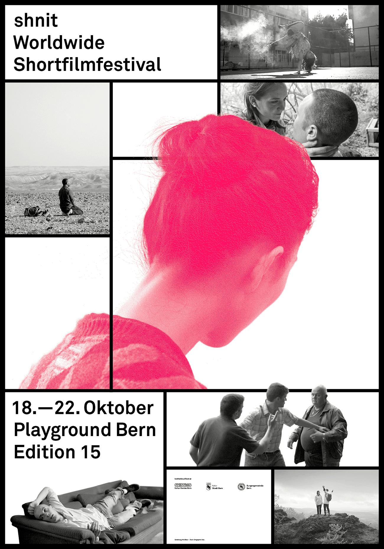 A contemporary festival poster featuring a bold modernist grid layout that combines black-and-white documentary photography with a striking neon pink abstract overlay. The design balances minimalist typography with dynamic visual storytelling, creating a sophisticated yet eye-catching promotional material for a short film festival.